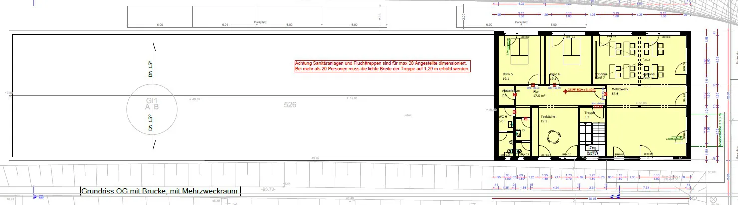 Im Obergeschoss sind weitere Büro- und Verwaltungsflächen angeordnet. Mehrere Büroräume sowie Sanitärbereiche bieten ein effizientes und angenehmes Arbeitsumfeld. Die klare Grundrissstruktur ermöglicht flexible Nutzungskonzepte für Einzel- und Teamarbeitsplätze sowie Besprechungsbereiche.